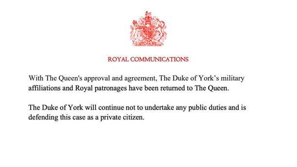 Официальное заявление Букингемского дворца гласит, что принц Эндрю лишается всех своих придворных обязанностей и в дальнейшем будет защищать себя в суде как частное лицо.