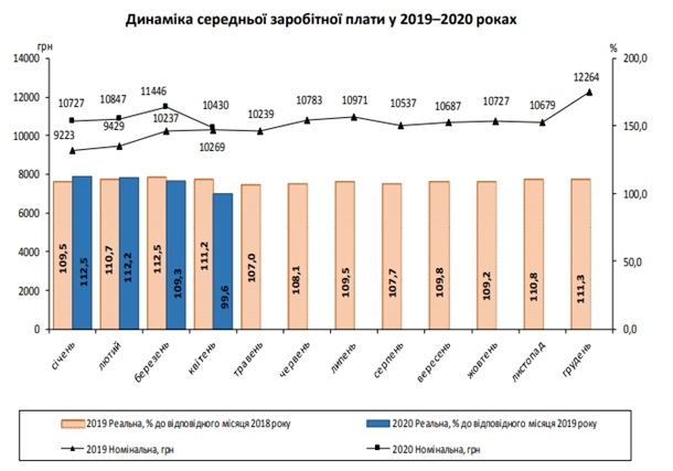 Это на 8,9 процента меньше по сравнению мартом (11 446 гривен). При этом реальная зарплата (с учетом инфляции) в апреле 2020 года к апрелю прошлого года сократилась на 0,4 процента, номинальная выросла на 1,6 процента.