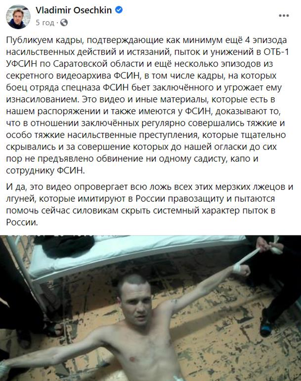 «Публикуем кадры, подтверждающие как минимум еще 4 эпизода насильственных действий и истязаний, пыток и унижений в ОТБ-1 УФСИН по Саратовской области и еще несколько эпизодов из секретного видеоархива ФСИН, в том числе кадры, на которых боец отряда спецназа ФСИН бьет заключенного и угрожает ему изнасилованием», — написал основатель Gulagu.net Владимир Осечкин в Facebook.