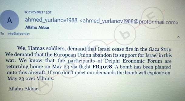 В сети появился скрин письма, которое якобы прислало движение ХАМАС в аэропорты Минска и Литвы с угрозой взорвать самолет Ryanair 23 мая. Копию письма публикует некоммерческий центр Досье Михаила Ходорковского совместно с изданиями The Daily Beast и Der Spiegel.