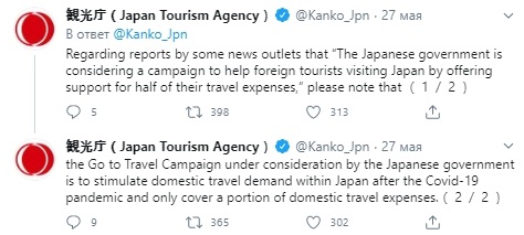 «Кампания Go To Travel рассматривается правительством Японии как инициатива, чтобы стимулировать внутренний туризм в Японии после пандемии COVID-19, и что она покроет только часть расходов на поездки внутри страны», — говорится в заявлении японского агентства по туризму в Twitter.