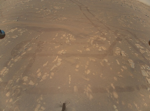 В ходе своего второго полета Ingenuity также сделал первую в истории цветную фотографию Марса с воздуха. На снимке видна тень вертолета, кончики его посадочных опор, а также следы колес ровера Perseverance.